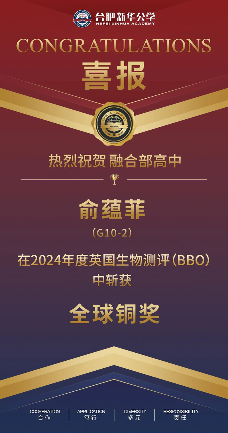 恭喜我校融合高中部G10-2的俞蘊(yùn)菲同學(xué),在2024年度英國(guó)生物測(cè)評(píng)(BBO)中獲得全球銅獎(jiǎng)的好成績(jī)。