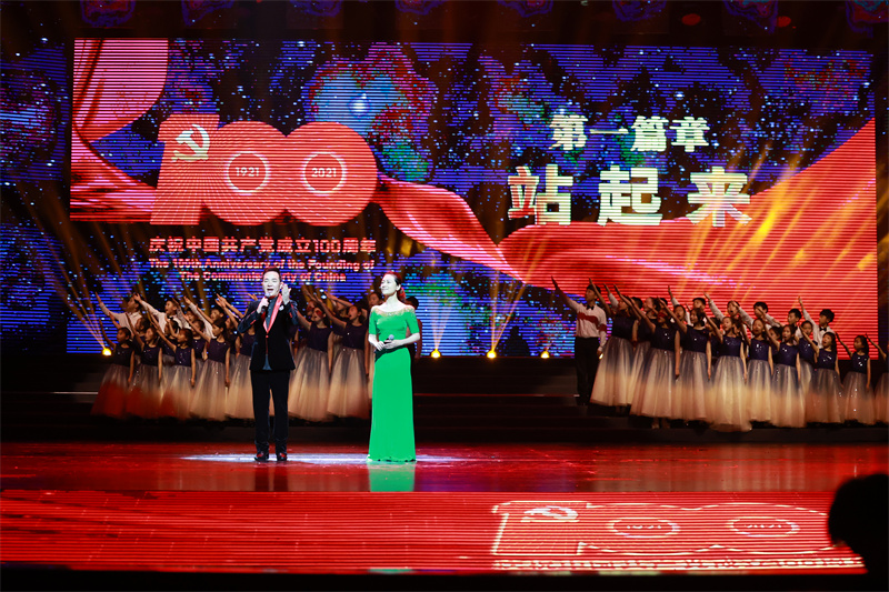 新華公學童聲合唱團完美的用哼鳴式演唱法為晚會三個篇章開場,用歌聲向中國共產黨百年華誕獻禮,用微笑和行動表明作為社會主義接班人的決心:“童心向黨,堅決跟黨走,聽從黨的指揮”。