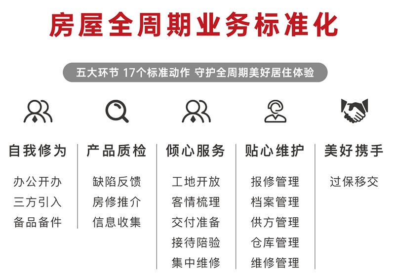 “我們的標(biāo)準(zhǔn)是什么?”“做到什么程度才叫標(biāo)準(zhǔn)化?”華地房屋維保中心團(tuán)隊(duì)從工作中總結(jié)經(jīng)驗(yàn),對(duì)標(biāo)行業(yè)標(biāo)桿,取長(zhǎng)補(bǔ)短。本著“以客戶為中心”的宗旨,伙伴們多次修訂終于完成了華地房屋維保七步法、全周期業(yè)務(wù)標(biāo)準(zhǔn)化的編制,包括自我修為、產(chǎn)品質(zhì)檢、傾心服務(wù)、貼心維護(hù)、美好攜手等五大模塊標(biāo)準(zhǔn)化。