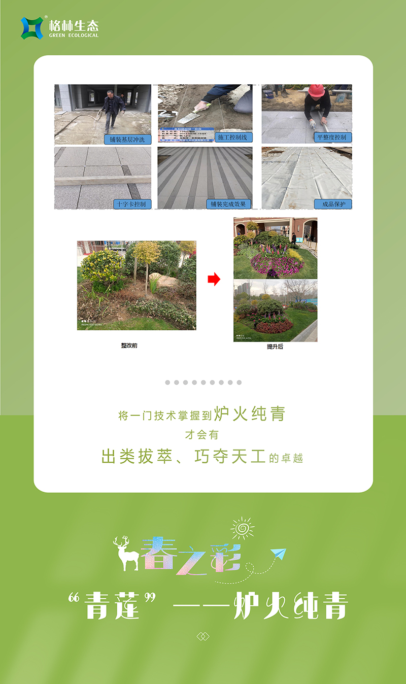 格林生態(tài)在日常培訓(xùn)中格外注重培養(yǎng)參訓(xùn)人員恪守匠德、提升匠藝、開拓匠心,潤(rùn)物細(xì)無聲般讓“能工巧匠”文化融入每一位員工血脈。我們定期編制、執(zhí)行、檢查反饋和改進(jìn)工藝技術(shù)標(biāo)準(zhǔn),每周進(jìn)行技術(shù)培訓(xùn)、考核,開展技藝大比拼,力求員工技術(shù)達(dá)到爐火純青的地步,但我們不僅要追求高超的工藝和技術(shù),更要對(duì)美好器物、超凡品質(zhì)去主動(dòng)探索,只有這樣才會(huì)讓自己的作品渾然天成、富有靈魂;也只有這樣的作品才會(huì)讓客戶滿意,而客戶臉上的笑容才是我們最終的驕傲。