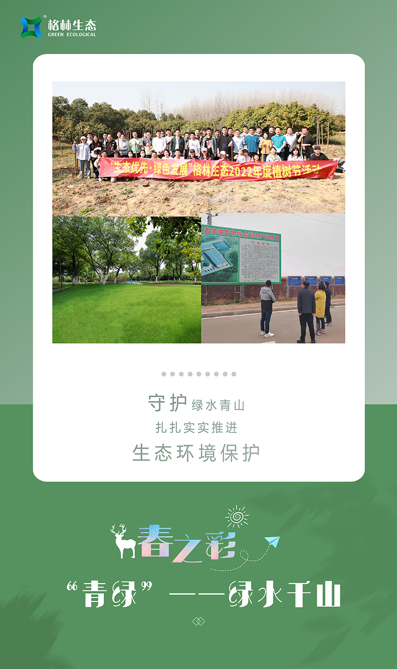我們牢記“綠水青山就是金山銀山”的生態(tài)理念,每年開展植樹活動(dòng),今年共植三百余株欒樹和紅葉石楠球,讓綠色在大地蔓延;與此同時(shí),格林生態(tài)積極履行社會(huì)責(zé)任,強(qiáng)化集約節(jié)約理念,與合作伙伴協(xié)同做好污水處理改善,促進(jìn)水生態(tài)環(huán)境持續(xù)改善,努力實(shí)現(xiàn)經(jīng)濟(jì)發(fā)展和生態(tài)環(huán)保雙贏目標(biāo)。現(xiàn)如今正是楊柳青青、草長(zhǎng)鶯飛之時(shí),傲人的青山綠水正在以秀美優(yōu)雅的姿態(tài)展現(xiàn)出來!